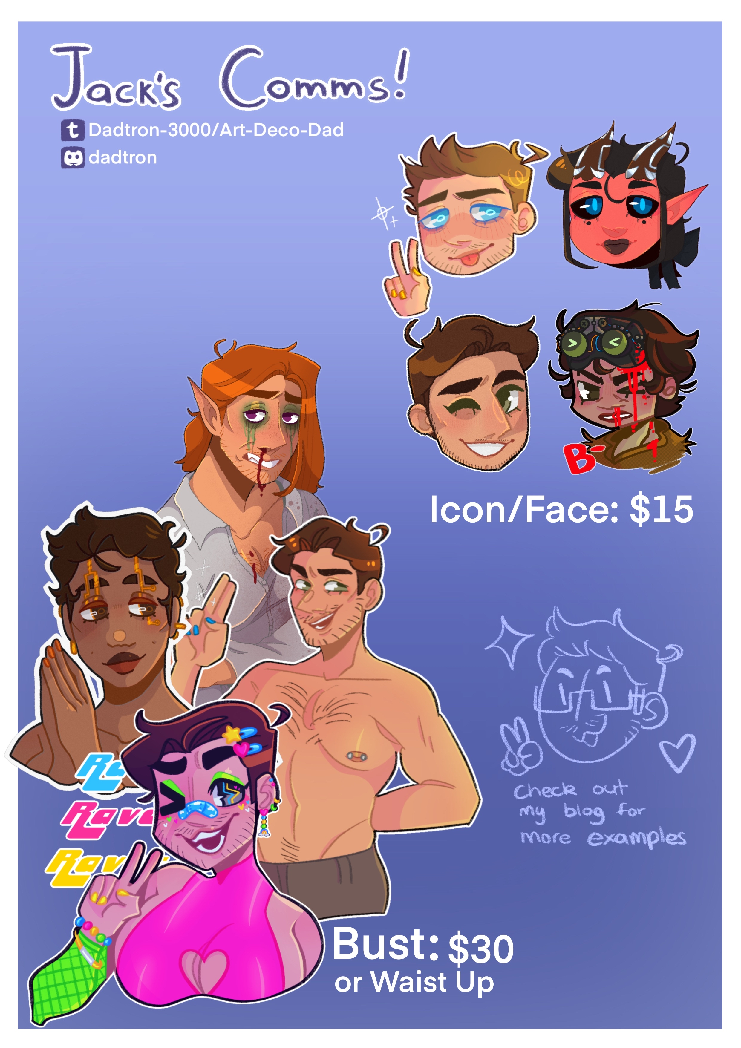 • WORKING ON BEING ABLE TO DRAW MECHI have the right to refuse any request if I do not feel comfortable with it.I usually take at least a couple of days depending on image, sketch is usually done in a few hours. this is not guaranteed, however.Paypal: Will not refund on full art completion, I send wips as I go and will always send rough sketches and first colour passes to see if anything needs to be changed. I can send an invoice via email if provided or via a link if using dms.Personal use ONLY. Edit it, use it as a profile picture or header, a discord sticker - with credit to me.Can print it yourself or use in crafts - keychain, cutouts, anything.Don’t use as an adopt or to re-sell.ABSOLUTELY NO AI------------------Prices:Extra Character - $5